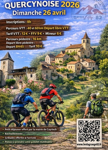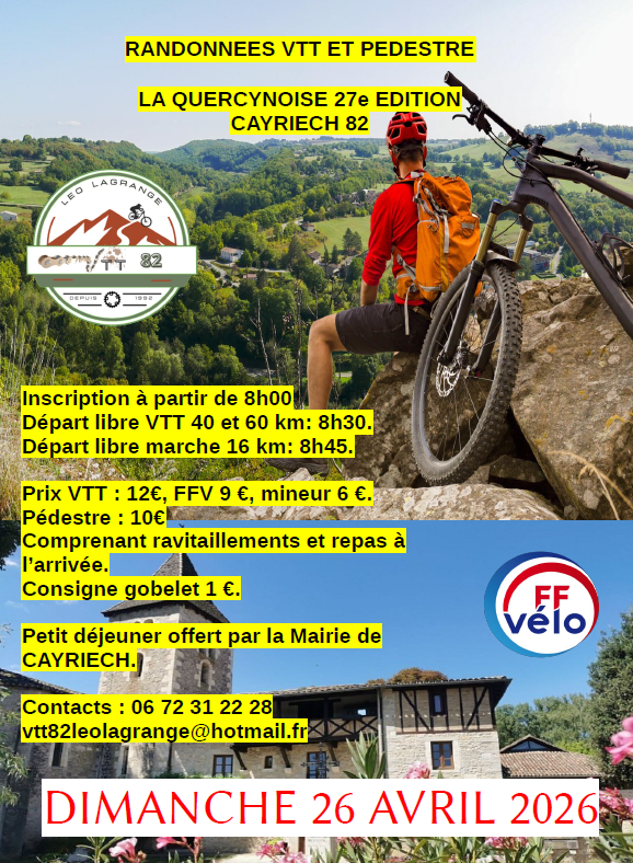 Le club VTT82 LEO LAGRANGE vous donne rendez-vous le dimanche 26 avril 2026 pour la Quercynoise au départ de Cayriech. Randonnée VTT et pédestre. Venez nombreux !!